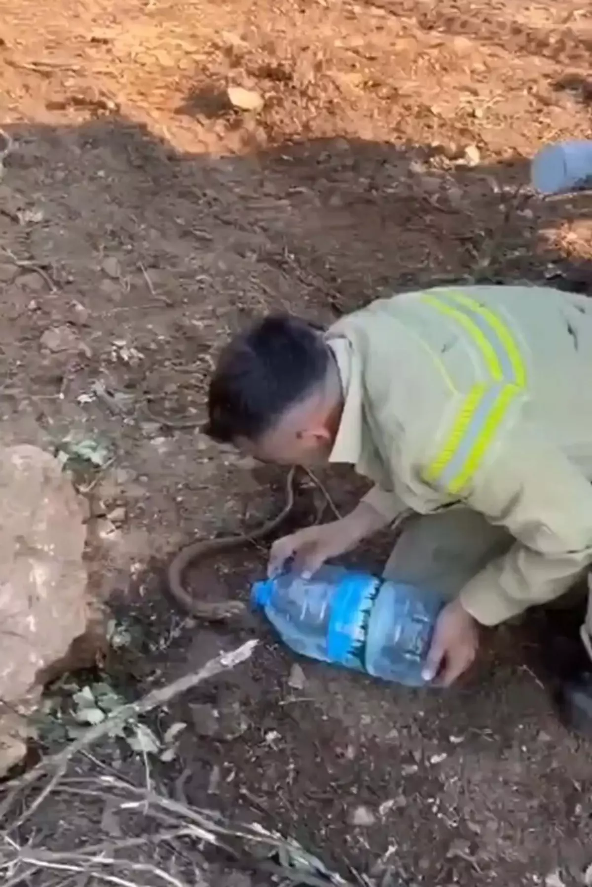 ÇANAKKALE’nin Ayvacık ilçesinde tarım yerinde çıkan yangından etkilenen oluklu kertenkeleye orman personellerinin su vererek serinlettiği anlar, cep telefonuyla görüntülendi.