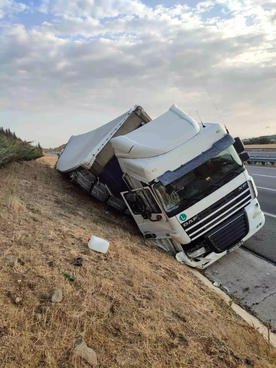 Balıkesir’den Bulgaristan‘a gitmek üzere yola çıkan Bulgaristan plakalı, dış cephe kaplama gereci yüklü tır, Balıkesir- Bursa kara yolunun 37’nci kilometresinde yan yattı.