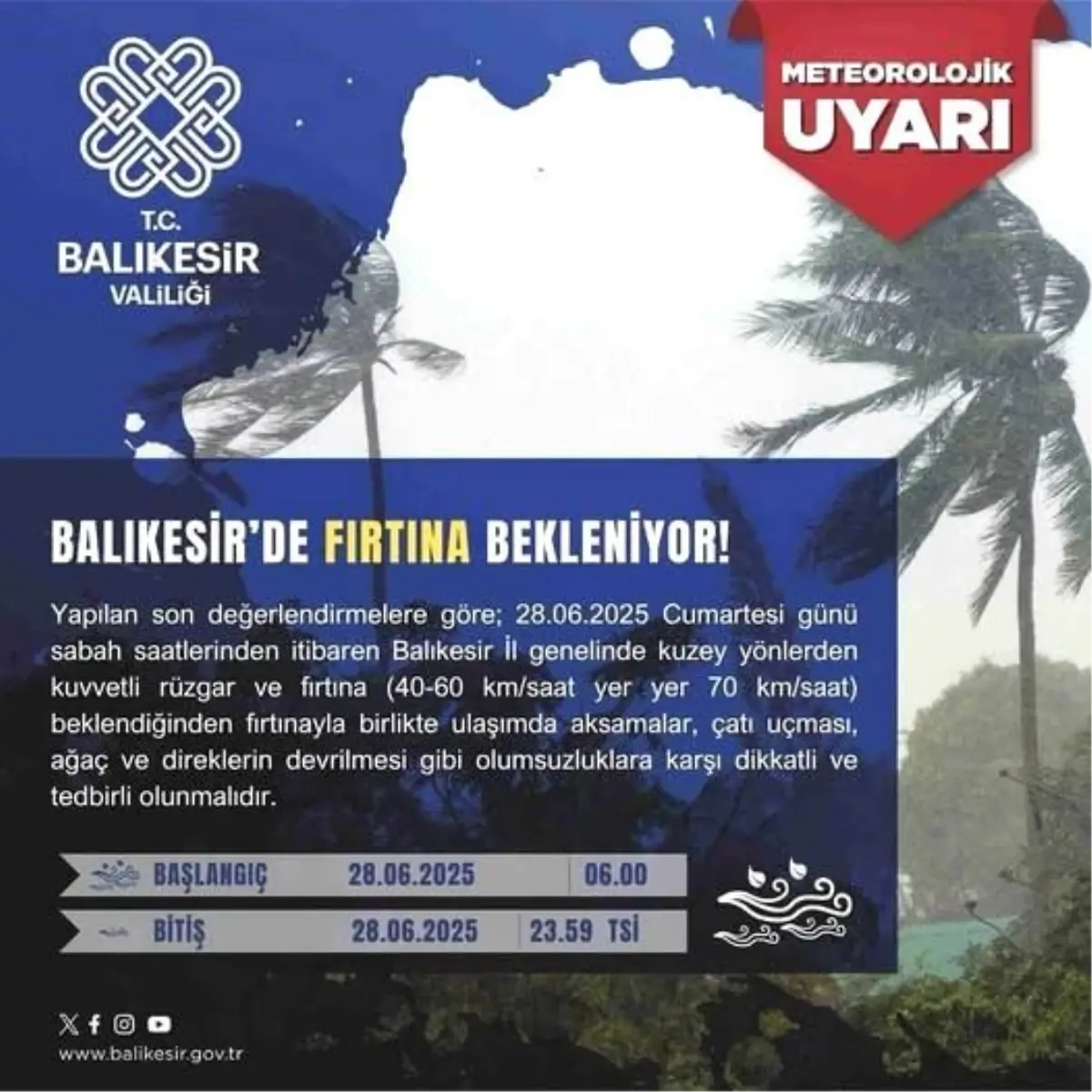 Balıkesir vilayet genelinde 28 Haziran Cumartesi günü sabah saatlerinden itibaren kuzey taraflardan kuvvetli rüzgar ve fırtına beklendiğinden meteoroloji ihtarlarda bulundu.