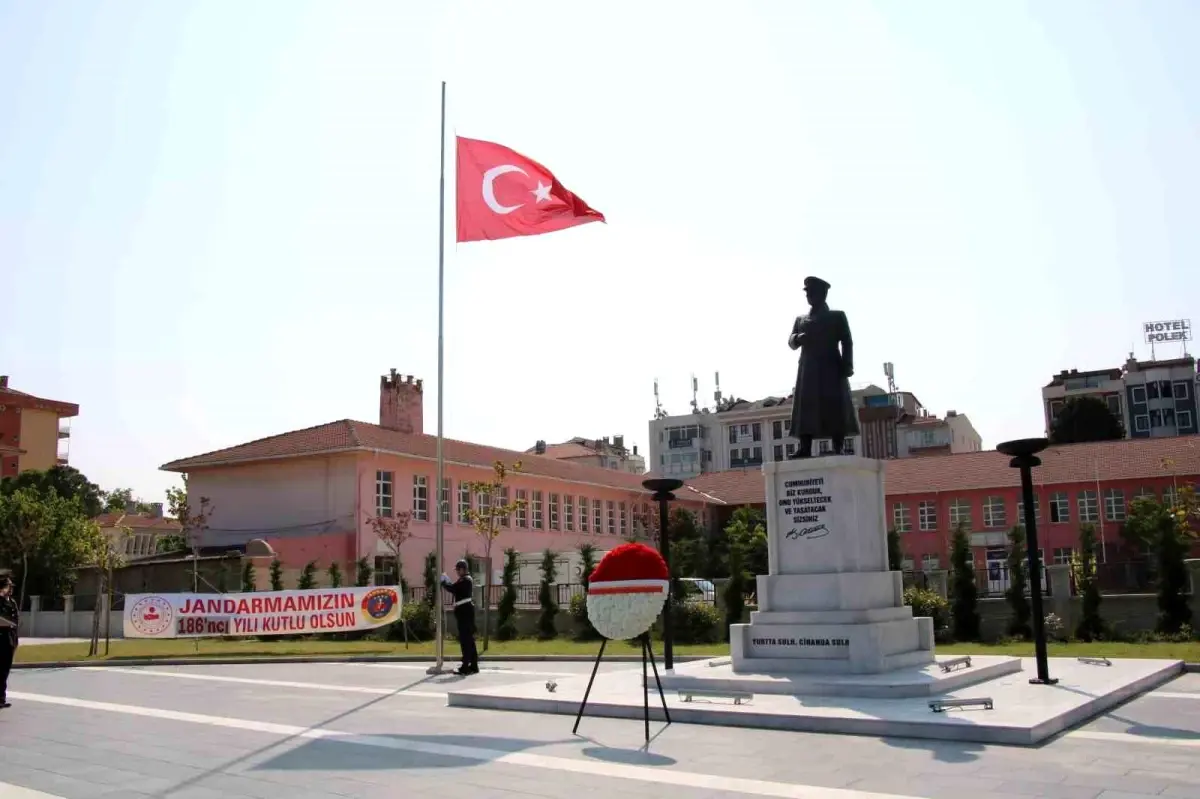 Çanakkale’de Cumhuriyet Meydanı’nda gerçekleştirilen merasimde Jandarma Teşkilatı’nın 186’ncı kuruluş yıl dönümü münasebetiyle Atatürk anıtı önüne çelenk bırakıldı.
