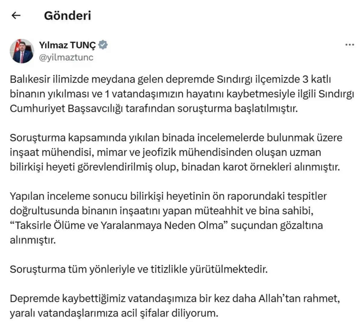 Adalet Bakanı Yılmaz Tunç, Balıkesir’de meydana gelen sarsıntıda 3 katlı binanın yıkılması ile ilgili soruşturma başlatıldığını açıkladı. Bakan Tunç, sosyal medya hesabından yaptığı açıklamada, “Balıkesir vilayetimizde meydana gelen sarsıntıda Sındırgı ilçemizde 3 katlı binanın yıkılması ve 1 vatandaşımızın hayatını kaybetmesiyle ilgili Sındırgı Cumhuriyet Başsavcılığı tarafından soruşturma başlatılmıştır. Soruşturma kapsamında yıkılan binada incelemelerde bulunmak üzere inşaat mühendisi, mimar ve jeofizik mühendisinden oluşan uzman bilirkişi heyeti görevlendirilmiş olup, binadan karot örnekleri alınmıştır. Yapılan inceleme sonucu uzman heyetinin ön raporundaki tespitler doğrultusunda binanın inşaatını yapan müteahhit ve bina sahibi, ‘Taksirle mevte ve yaralanmaya neden olma’ kabahatinden gözaltına alınmıştır. Soruşturma tüm taraflarıyla ve titizlikle yürütülmektedir. Sarsıntıda kaybettiğimiz vatandaşımıza bir defa daha Allah’tan rahmet, yaralı vatandaşlarımıza acil şifalar diliyorum” dedi.